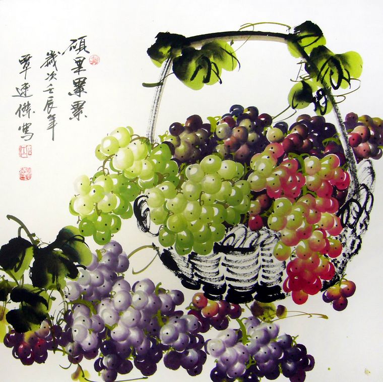 葡萄,有着很好的风水寓意。葡萄题材的作品代表着吉祥喜庆、多子多孙、 “多子多福”寓意人丁兴旺、“一本万利”,是字画装饰中常见的吉利风水字画,这幅斗方葡萄图中,葡萄颗粒饱满用色稳而不失明快及晶莹剔透的质感,此幅佳作最宜悬挂于餐厅的墙上,既雅致清新,又别具装饰性。