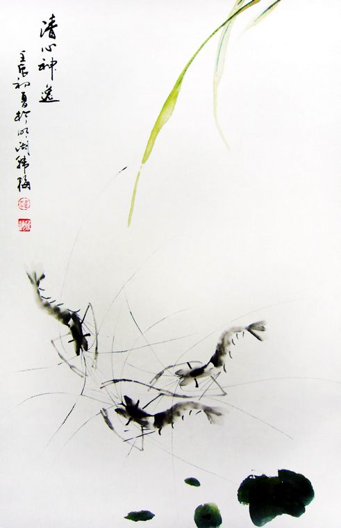 画国画虾,,淡墨绘成的躯体更显虾体晶莹剔透之感。韩老师别出心裁以花青点写荷叶,虽不著一水,却尽得风流,虾儿犹如在水中竞逐,灵动活泼,生机盎然。观此画可以感受到恬淡、安逸的生活,令心情舒畅,是餐厅装饰的必备元素。