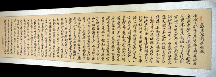 第一字画网的八尺对开前赤壁赋书法,已完成装裱。这幅书法作品前赤壁赋装裱后尺寸达到2.8米长,从这幅前赤壁赋赏析中看出作品笔法老练,清新秀丽,如果放在画廊出售,广西书协泉深老师此幅书法前赤壁赋的标价在3000元左右。