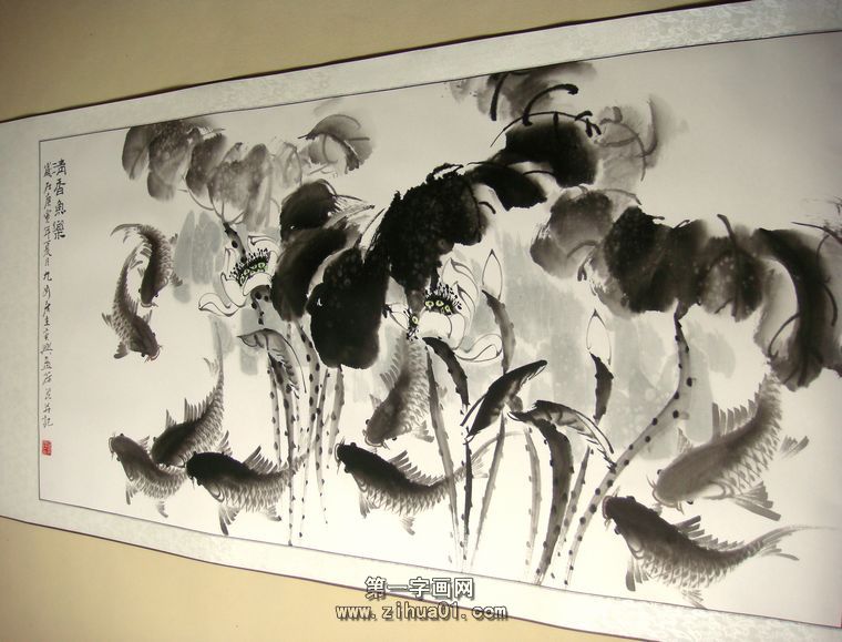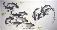 第一字画网的黑色水墨九鱼图,是一副非常清新的四尺九鱼作品,作品画风细腻、栩栩如生,九鱼与荷花的布局十分合理,题字为清香鱼乐,如果放在画廊出售,汪艺新老师此副四尺黑色水墨九鱼图裱完后的标价在1000元左右。“鱼”与“余”谐音,鱼则象征着富贵,九鱼又代表长长久久连年有余的意思,所以中国吉祥图案中常有鱼的图案。