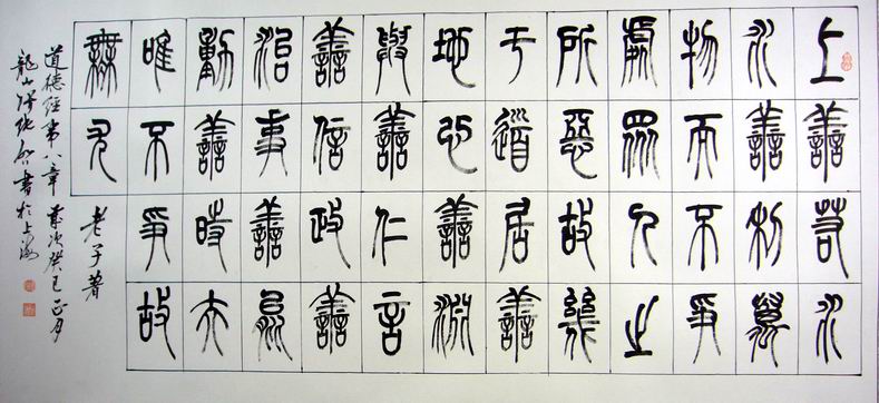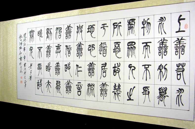 第一字画网的四尺书法道德经,适合作为挂在家里客厅或书房,也适合挂在公司的办公室。这幅四尺书法上善若水是书法名家张纯启老师的作品,装裱后长度约在1.8米左右,作品笔法老练苍劲大气,如果放在画廊出售,张纯启老师此副道德经书法作品裱完后的标价远大于网上价格。