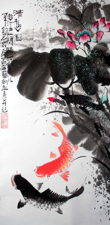第一字画网的水墨荷花鱼,这幅三尺的荷花鱼裱完后长度近1.6米左右,是一副非常清新的鱼作品,题字为清趣图,挂在家里客厅或是送人都是非常不错的选择,如果放在画廊出售,艺新老师此副水墨荷花鱼裱完后的标价在700元左右。“鱼”与“余”谐音,鱼则象征着富贵,所以中国吉祥图案中常有鱼的图案。