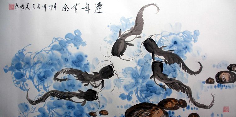 第一字画网的字画连年有余,这幅四尺的鱼作品裱完后尺寸近1.8米左右,是一副非常清新的作品,作品画风细腻、栩栩如生,挂在家里客厅或是送人都是非常不错的选择,如果放在画廊出售,王美琦老师此副字画连年有余裱完后的标价在1000元左右。“鱼”与“余”谐音,鱼则象征着富贵,所以中国吉祥图案中常有鱼的图案。