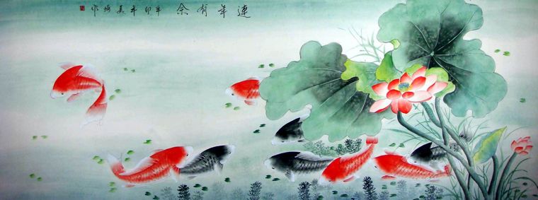 第一字画网的六尺工笔九鱼,这幅小六尺的工笔九鱼作品裱完后尺寸近2.2米左右,是一副非常清新的作品,作品画风细腻、栩栩如生,九鱼图寓意着长长久久,吉祥如意,挂在家里客厅或是送人都是非常不错的选择,如果放在画廊出售,王美琦老师此副六尺工笔九鱼裱完后的标价在2000元左右。“鱼”与“余”谐音,鱼则象征着富贵,所以中国吉祥图案中常有鱼的图案。九鱼图中,“九”取长长久久之意,“鱼”取其万事如意,寓意年年有余,富贵有余。
