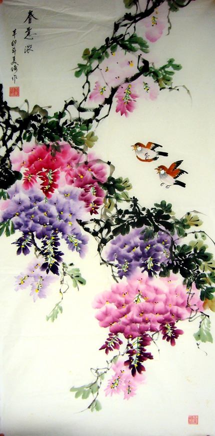 第一字画网的水墨画花鸟,这幅四尺花鸟作品非常适合挂在家里的餐厅或客厅,装裱后尺寸达到1.8米长,作品细腻生动、栩栩如生,如果放在画廊出售,王美琦老师此幅水墨画花鸟的标价起码在1200元左右。