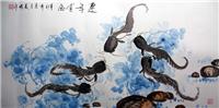 第一字画网的水墨鱼作品,这幅四尺的水墨鱼是幅适合餐厅的画,装裱后尺寸达到1.8米长,作品细腻生动,寓意连年有余,如果放在画廊出售,王美琦老师此幅水墨画连年有余的标价在1200元左右。