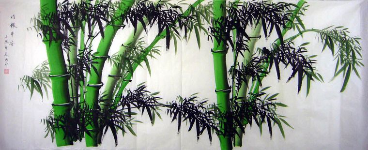 第一字画网的巨幅国画竹子,这幅小八尺的彩竹图非常适合挂在大型的会议室,或是酒店的大厅等场合,画芯的尺寸就达到了2.4米长,作品细腻生动、如果放在画廊出售,美琦老师巨幅八尺国画竹子的标价在2500元左右。竹子长的亭亭玉立、节坚心虚,有君子之风,象征挺拔和坚强不屈,故人们将竹子以高洁品质而称颂,为一种吉祥象征物。竹心空虚,所以象征着谦虚的美德。竹子四季常青不变色,因此也用来形容老年人健康的象征。“竹”又与“祝”谐音,有美好祝福的习俗意蕴。