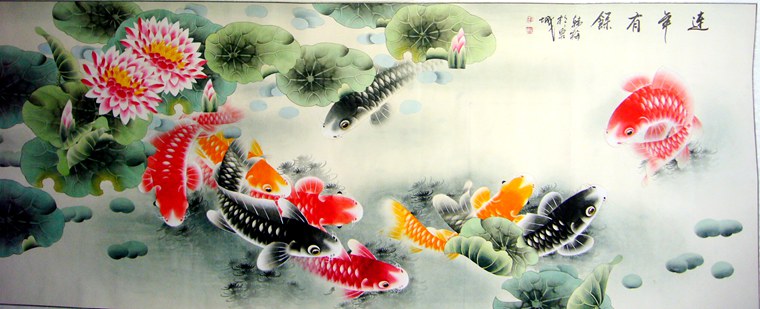 第一字画网的小六尺精品工笔九鱼图,这幅小六尺的工笔画九鱼图装裱后长2.2米左右,是一幅非常喜气的作品,九鱼图寓意长长久久、连年有余,作品挂在家里餐厅或客厅都是不错的选择,作品水准非常出色,意境生动,给观者一种此间自有幽真趣,淡墨轻岚共一体的感觉。如果放在画廊出售,韩梅老师此幅小六尺精品工笔九鱼图的标价在3500元左右。