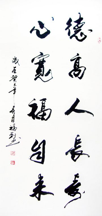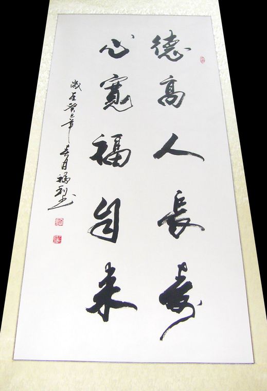 第一字画网送长辈礼物,是副适合挂办公室或客厅的书法作品,非常适合送老人家的作品,这幅作品装裱后尺寸达1.8,笔法老练,如果放在画廊出售,山东书协名家福利老师此副作品的标价在1000元左右。