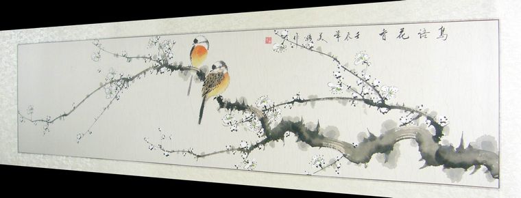 第一字画网的餐厅挂画,作品适合作为四尺对开花鸟画,也可以挂书房、卧室或是玄关过道处,是一幅很有意境的花鸟作品。这幅四尺对开作品灵感十足,题字为鸟语花香,如果放在画廊出售,王美琦老师此幅四尺对开花鸟画的价格大约在800元左右。