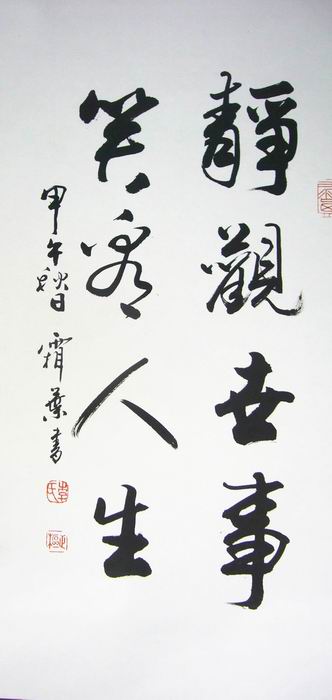 第一字画网的人生哲言书法,这幅书法作品内容为:静观世事、笑看人生;表达了人生需要有一种沉稳的心理和积极的心态。装裱后长度约在1.5米左右,作品笔法老练,如果放在画廊出售,李正枢老师此幅人生哲言书法的标价大约在1200元左右。李正枢老师,字霜叶,云南的老书法家,兰亭杯书法大赛的特邀参展嘉宾,擅长行楷,几十年的书法功力,功力深厚。李老师四尺对开书法在云南的艺术品拍卖行已经是2000元起拍价了,书法的实力不用多说,光看字的水准就知道了。