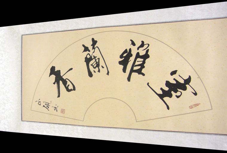 • 产品简介: 扇形书法室雅兰香,广西书法家甘正砚作品,已装裱。