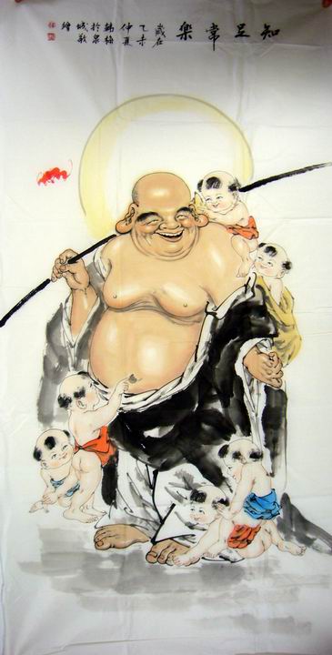 第一字画网的国画五子闹佛,作品画法精妙,栩栩如生,是人物画中水准出色的弥勒佛作品,装裱后长1.8米左右,可以直接悬挂,如果放在画廊出售,韩梅老师此幅国画五子闹佛的标价在1800元左右。