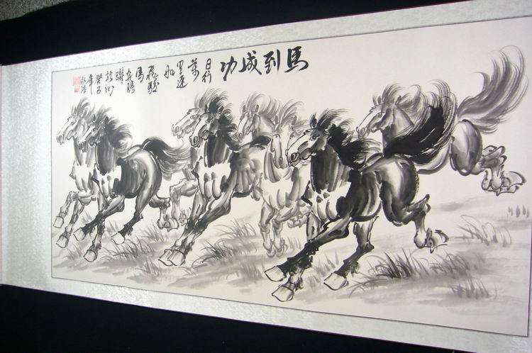 第一字画网的水墨国画八骏图,作品整体气势磅礴,尽显马之神韵,裱完后的长度达到1.8米左右,这幅四尺国画八骏图挂在家里的客厅或是公司的会议室都是非常气派,送人也是很不错的选择。如果放在画廊出售,永浩老师此幅水墨国画八骏图的标价起码在1500元左右。