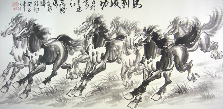 池永浩,1964年出生于内蒙古乌海,职业画家,内蒙古子岩书画院高级画师。自幼学习绘画,尤以画马著称,曾多年在内蒙大草原观察骏马的习性,实地写生给奔马作品带来了灵气。他的水墨画奔马作品以草原写生风格和写意画法结合在一起,构成了一种独特的的气势,作品延习徐悲鸿奔马之灵气,八骏奔马作品交叉错落,在不断的艺术创作中又向更多马的形态、更多马的数量组合转变,