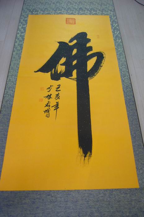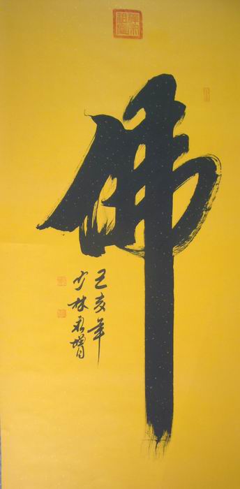 释永增大师对书法艺术的追求,释永增历来是虔诚而执着的,不求功利,对每幅书法的创作也是认真而严谨的,尽量完美,他十分重视作品的整体神韵和章法的随意成妙,他的行草书格调高雅、自然洒脱、点划精到;行书笔力遒劲、气韵畅达、意趣横生。如果放在画廊出售,释永增大师此幅四尺名家书法佛的标价大约在25000元左右。