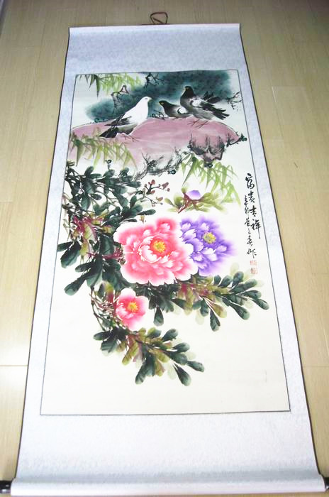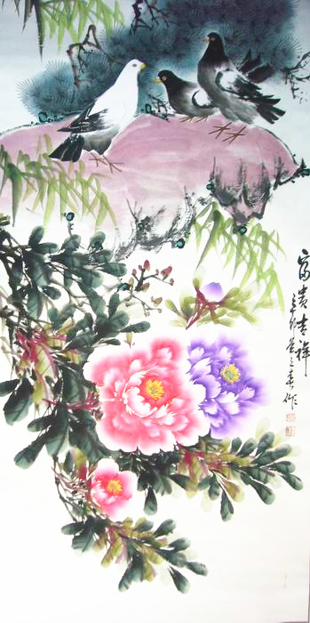 第一字画网的四尺白鸽牡丹图,作品裱完后长度在1.8米左右,画功不俗,是西北画院资深画师李庆老师的作品,题字为富贵吉祥,如果放在画廊出售,此副四白鸽富贵牡丹图裱完后的标价在1200元左右。