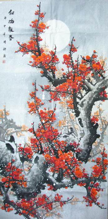 第一字画网的玄关国画红梅报春图,数量仅一幅,是幅适合客厅或居室挂的梅花作品,是一幅性价比很高的全手绘四尺梅花作品,如果放在画廊出售,广西画家明科老师此幅五福梅花图的标价大约在1500元左右。