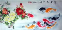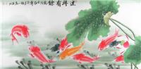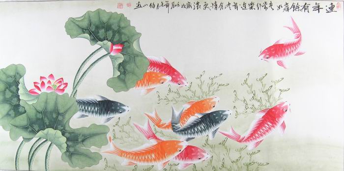 第一字画网的国画鱼工笔鱼,这幅四尺的荷花鱼图画九鱼图作品裱完后长度近1.8米左右,是一幅水准上佳的作品,作品画风细腻、栩栩如生,荷花出淤泥而不染,濯清涟而不妖,寓意纯洁、洁白。鲤鱼象征富贵,有余而富足,二者结合招财纳福、趋吉避凶。挂在家里客厅或是送人都是非常不错的选择,如果放在画廊出售,谭佰川老师此幅连年有余九鱼图、国画鱼,鱼国画,工笔鱼的标价在1500元左右。