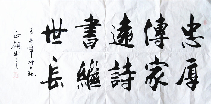 第一字画网的书法经典名句书法作品,是幅适合挂客厅或公司办公室的书法作品,作品内容为:忠厚传家远,诗书继世长。由广西书法家甘正砚老师书写完成,这幅人生励志名言名句书法字体大气,笔法老练,已经装裱完成,装裱后尺寸达到1.8米长,如果放在画廊出售,广西书法家甘正砚老师这幅四尺的人生名言名句书法的标价在1600元左右。