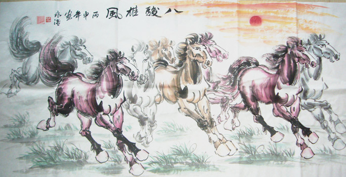 第一字画网的动物画骏马图《马到成功》,作品整体气势磅礴,尽显马之神韵,裱完后的长度达到1.8米左右,这幅四尺国画八骏图骏马图挂在家里的客厅或是公司的会议室都是非常气派,送人也是很不错的选择。如果放在画廊出售,永浩老师此幅动物画骏马图国画八骏图的标价起码在1500元左右。