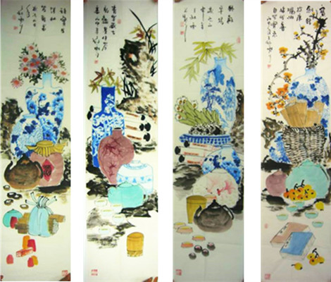 国画四条屏花鸟画
