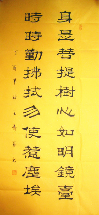 第一字画网的六祖慧能的禅悟书法,适合挂在公司的办公室,或是家里的书房,这幅手写毛笔隶书书法作品是寿善老师的作品,装裱后长度约在1.5米左右,办公室书法字画作品笔法老练苍劲大气,寿善老师此幅六祖慧能的禅悟办公室书法字画的标价大约在1500元左右。
