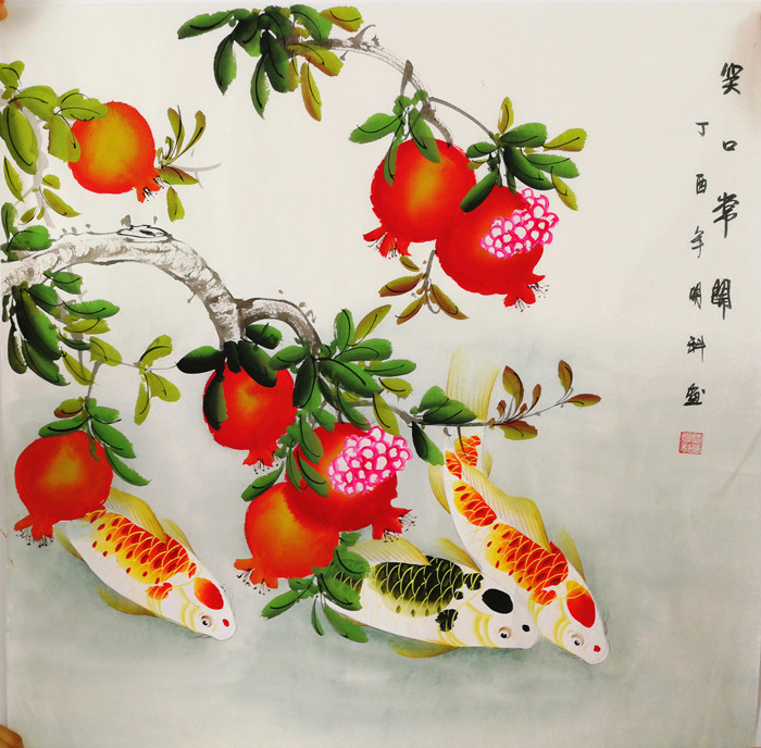 第一字画网的写意三条鱼画佳作,这幅四尺斗方的作品写意花鸟画《笑口常开》适合作为进门玄关挂画,玄关挂画选择石榴鱼图效果不错,这幅非常清新的写意鱼画作品,挂在家里或是送人都是非常不错的选择,如果放在画廊出售,广西画家诸葛明科老师此幅四尺斗方国画玄关画的标价在1500元左右。“鱼”与“余”谐音,鱼则象征着富贵,所以中国吉祥图案中常有鱼的图案。