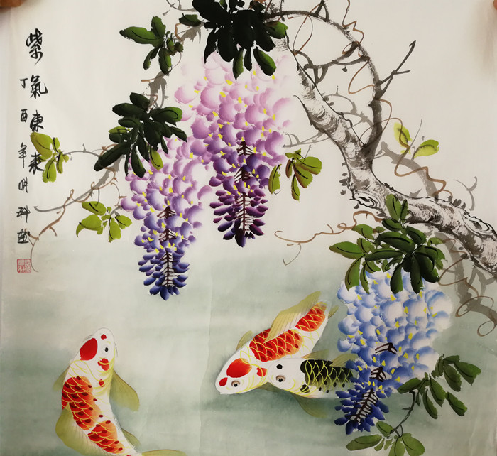 第一字画网的工笔鱼佳作,这幅四尺斗方的作品适合作为进门玄关挂画,玄关挂画选择鲤鱼图效果不错,这幅非常清新的工笔鱼作品,题字为金玉满堂,挂在家里或是送人都是非常不错的选择,如果放在画廊出售,广西画家诸葛明科老师此幅四尺斗方玄关画的标价在1500元左右。“鱼”与“余”谐音,鱼则象征着富贵,所以中国吉祥图案中常有鱼的图案。