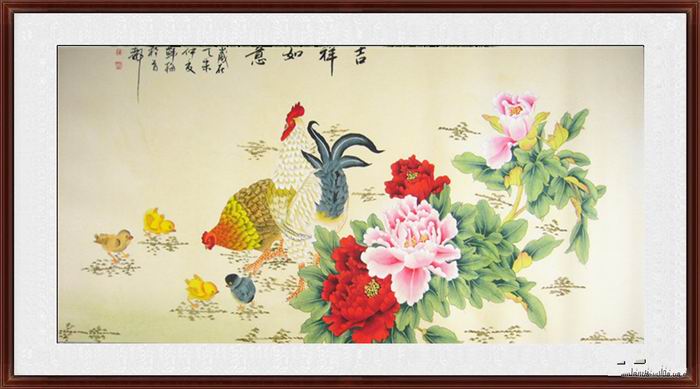 • 产品简介: 工笔牡丹雄鸡图客厅装饰画,齐鲁名家韩梅老师精品花鸟画