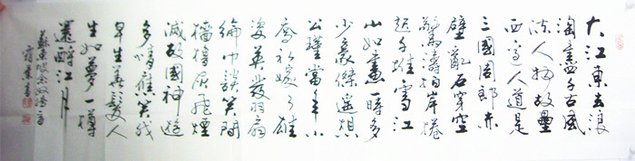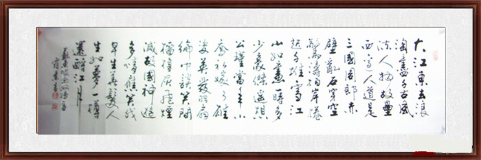第一字画网的总经理办公室书法赤壁怀古,从这幅书法赤壁怀古欣赏中看出,作品的功底非常老练,适合挂在办公室或家里的客厅等场合,作品装裱后尺寸达1.8米,如果放在画廊出售,李正枢老师此幅办公室会议室书法赤壁怀古的标价起码在2500元左右。