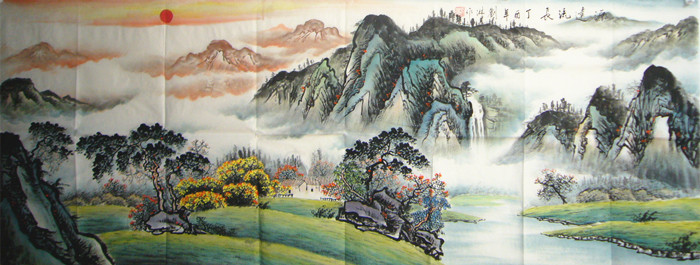 第一字画网的办公室风水国画国画山水画《源远流长》裱完后尺寸近2.2米左右,是一幅大气磅礴的小六尺山水,作品意境生动、山水交汇,清新秀雅,布局合理,视觉效果上佳,看作品的气势、云层和山脉的细节,就能看出老师的深厚画功,画面上的红日寓意着鸿运高照,如果放在画廊出售,刘淋老师此幅山水画泰山日出的标价在5000元左右,作品的气势和画功都是一流的,适合挂在客厅、或公司的会议室等场合。