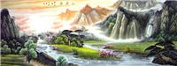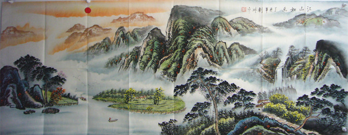 第一字画网的写意国画山水画国画山水画《江山如画》装裱以后在2.2米左右,是一幅大气磅礴的小六尺山水,作品意境生动、山水交汇,清新秀雅,布局合理,视觉效果上佳,看作品的气势、云层和山脉的细节,就能看出老师的深厚画功,画面上的红日寓意着鸿运高照,如果放在画廊出售,刘淋老师此幅山水画泰山日出的标价在5000元左右,作品的气势和画功都是一流的,适合挂在客厅、或公司的会议室等场合。
