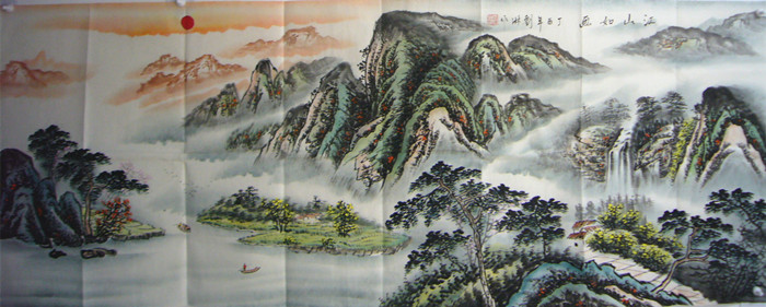 第一字画网的写意客厅国画山水画国画山水画《江山如画》装裱以后在2.2米左右,是一幅大气磅礴的小六尺山水,作品意境生动、山水交汇,清新秀雅,布局合理,视觉效果上佳,看作品的气势、云层和山脉的细节,就能看出老师的深厚画功,画面上的红日寓意着鸿运高照,如果放在画廊出售,刘淋老师此幅山水画泰山日出的标价在5000元左右,作品的气势和画功都是一流的,适合挂在客厅、或公司的会议室等场合。