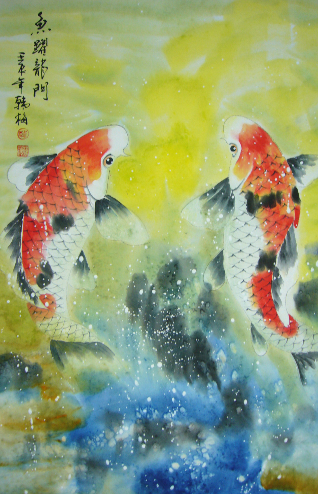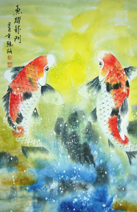 • 产品简介: 吉祥画鱼跃龙门,齐鲁画家韩梅作品,已装裱。