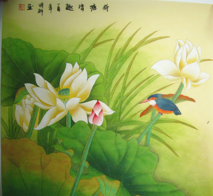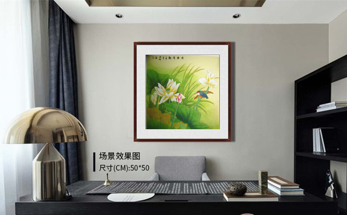 第一字画网的斗方荷花鸟图《荷塘清趣》,这幅四尺斗方的写意国画花鸟画装裱后尺寸为0.8米左右,是一幅非常温馨的作品,作品画风细腻、栩栩如生,十分雅致。挂在家里客厅或公司的会客室都是非常不错的选择,亦可用作送礼等场合,如果放在画廊出售,诸葛明科老师此幅工笔斗方荷花鸟图《荷塘清趣》的标价在1500元左右。