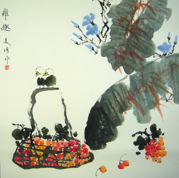第一字画网的餐厅果蔬花鸟画,这幅斗方果蔬花鸟图画面温馨,挂在家里客厅、卧室或是送人都是非常不错的选择,如果放在画廊出售,王美琦老师此幅家居花鸟国画裱完后的标价在1000元左右。