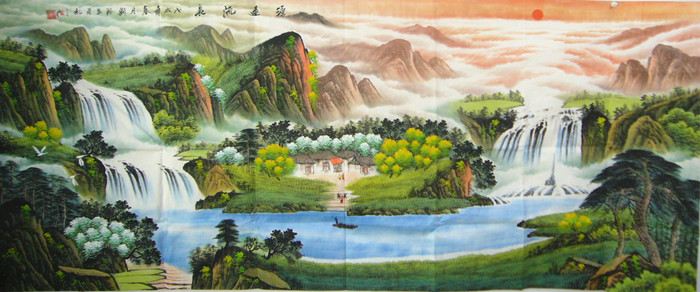 聚宝盆:此画是第一字画网推荐的客厅山水画源远流长。刘淋老师整幅作品根据风水布局、满含鸿运当头,财运如浩浩瀑水,生生不息之意。作品整体看来象个金元宝。远山层峦叠峰,更表达了源远流长的意境。因此挂山水画是非常吉利的。将此风水画悬挂于厅堂,立添主人财气,令人一见即生舒适安逸之感,获人兴财旺之效。青山绿松间配上了瀑布流水,不仅给画面增添了灵韵和动感,更表现了一种财源滚滚,源远流长的吉祥意义。非常适合家居,企业正堂装挂及馈赠亲朋好友的上佳之选~!!!
