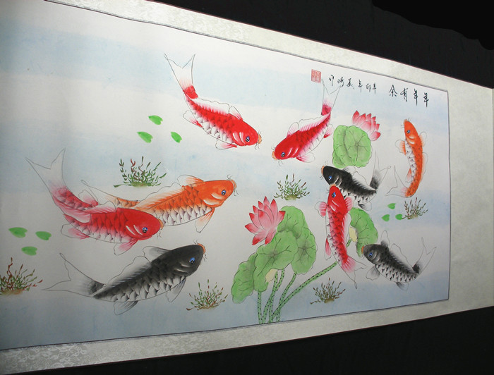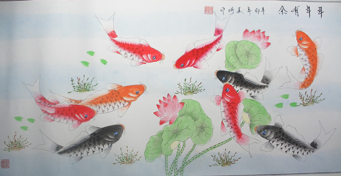 第一字画网的年年有余九鱼图作品,这幅四尺的九鱼作品裱完后尺寸近1.8米左右,是一幅非常清新的作品,作品画风细腻、栩栩如生,九鱼图寓意着长长久久,吉祥如意,挂在家里客厅或是送人都是非常不错的选择,如果放在画廊出售,王美琦老师此幅九鱼图作品的标价在1500元左右。“鱼”与“余”谐音,鱼则象征着富贵,所以中国吉祥图案中常有鱼的图案。九鱼图中,“九”取长长久久之意,“鱼”取其万事如意,寓意年年有余,富贵有余。