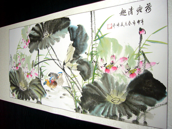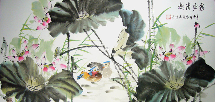 第一字画网的写意荷花鸳鸯画,是幅适合客厅或居室挂的荷花花鸟画。这幅家居花鸟画是副温馨祥和的水墨花鸟作品,装裱后长度达到1.8米左右,作品细腻生动、栩栩如生。如果放在画廊出售,王美琦老师此幅四尺家居花鸟鸳鸯图的标价大约在1500元左右。