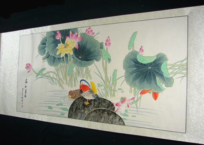 第一字画网的国画鸳鸯《家和美满》,这幅四尺的工笔鸳鸯图装裱后长1.8米左右,是一副非常温馨的作品,作品画风细腻、栩栩如生,十分雅致。挂在家里客厅或公司的会客室都是非常不错的选择,亦可用作送礼等场合,如果放在画廊出售,韩梅老师此副国画鸳鸯的标价在2000元左右。