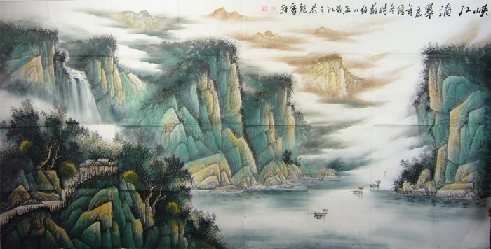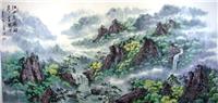 第一字画网推荐的国画写意山水画,适合作为客厅沙发背景画,同样也可以挂在公司的会议室等场合,这幅大八尺写意山水画 作品裱完后尺寸达到2.8米长,非常大气,作品风格清新秀雅,笔触细腻,看画中的细节能展现出谭佰川老师的精湛画功。如果放在画廊出售,谭佰川老师此幅山水画作品在画廊的标价在6000元左右。