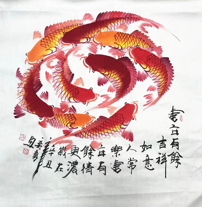 • 产品简介: 四尺斗方九鱼图,奕勇老师作品。