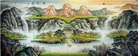 聚宝盆:此画是第一字画网推荐的四季聚宝盆山水画刘淋老师整幅作品根据风水布局、财运如浩浩瀑水,生生不息之意。作品整体看来象个金元宝。远山层峦叠峰,更表达了源远流长的意境。因此挂山水画是非常吉利的。将此风水画悬挂于厅堂,立添主人财气,令人一见即生舒适安逸之感,获人兴财旺之效。青山绿松间配上了瀑布流水,不仅给画面增添了灵韵和动感,更表现了一种财源滚滚,源远流长的吉祥意义。非常适合家居,企业正堂装挂及馈赠亲朋好友的上佳之选~