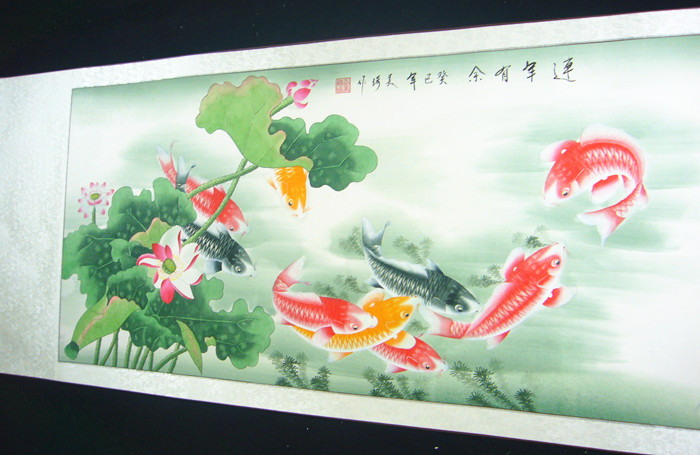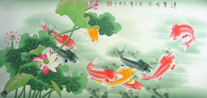 第一字画网的九鱼图连年有余,这幅四尺的九鱼作品裱完后尺寸近1.8米左右,是一幅非常清新的作品,作品画风细腻、栩栩如生,九鱼图寓意着长长久久,吉祥如意,挂在家里客厅或是送人都是非常不错的选择,如果放在画廊出售,王美琦老师此幅九鱼图作品的标价在1500元左右。“鱼”与“余”谐音,鱼则象征着富贵,所以中国吉祥图案中常有鱼的图案。九鱼图中,“九”取长长久久之意,“鱼”取其万事如意,寓意年年有余,富贵有余。