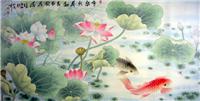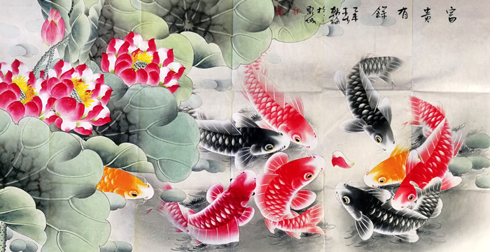 第一字画网的工笔荷花九鱼图,这幅三尺的富贵九鱼国画裱完后长度近1.5米左右,是一副非常清新的九鱼作品,题字为富贵有余,九鱼图寓意着长长久久,吉祥如意,挂在家里客厅或是送人都是非常不错的选择,如果放在画廊出售,韩梅老师此副工笔九鱼图裱完后的标价在2000元左右。“鱼”与“余”谐音,鱼则象征着富贵,所以中国吉祥图案中常有鱼的图案。九鱼图中,“九”取长长久久之意,“鱼”取其万事如意,寓意年年有余,富贵有余。