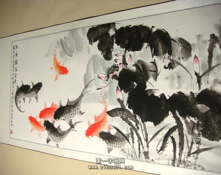 第一字画网的四尺九鱼图,数量只有唯一的一幅,售完即止。是一副非常清新的四尺九鱼作品,作品画风细腻、栩栩如生,九鱼与荷花的布局十分合理,题字为清香鱼乐,如果放在画廊出售,汪艺新老师此副四尺九鱼图裱完后的标价在1000元左右。“鱼”与“余”谐音,鱼则象征着富贵,九鱼又代表长长久久连年有余的意思,所以中国吉祥图案中常有鱼的图案。